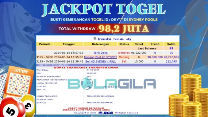 BOLAGILA JACKPOT TOGEL DI SYDNEY POOLS Rp 98,200.000,- LUNAS