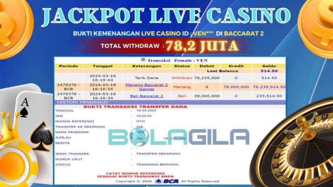 MEMBER BOLAGILA MENERIMA PELUNASAN KEMENANGAN BOLAGILA JACKPOT LIVE CASINO BACCARAT 2 Rp 78.200.000,- LUNAS