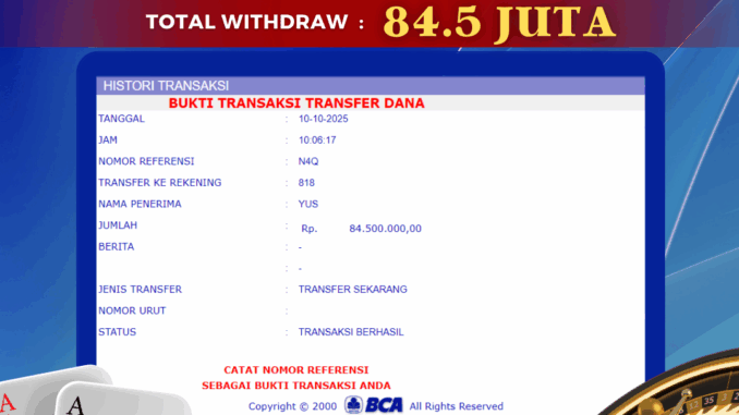 Bukti transfer yang dapat anda lihat adalah bukti SAH / VALID yang langsung di dapatkan melalui bukti transaksi dari Bank yang digunakan untuk pengiriman dana pada rekening pemilik user id. Terima kasih kami sampaikan kepada para pengguna setia BOLAGILA yang telah menggunakan situs kami, sebagai Bandar Terpercaya yang pastinya membayar semua kemenangan member hingga lunas. Apakah BOLAGILA PENIPU ? Reputasi “BOLAGILA TERPERCAYA” sudah sangat melekat.