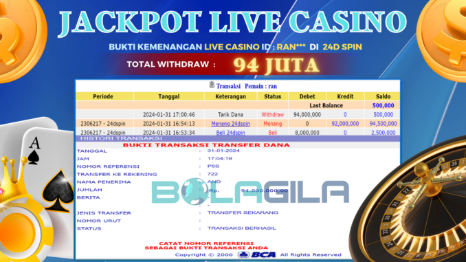 BOLAGILA JACKPOT LIVE CASINO di 24D SPIN Rp 94.000.000,- LUNAS