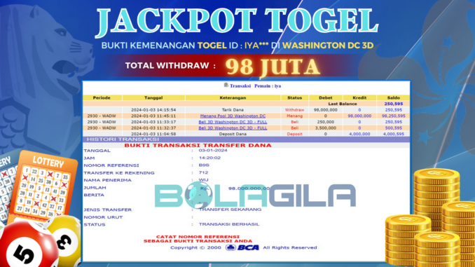 BOLAGILA JACKPOT TOGEL di WASHINGTON DC 3D Rp 98.000.000,- LUNAS