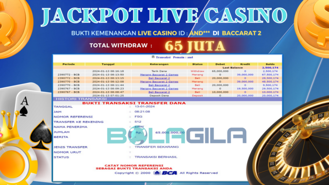 BOLAGILA JACKPOT LIVE CASINO di BACCARAT Rp 65.000.000,- LUNAS