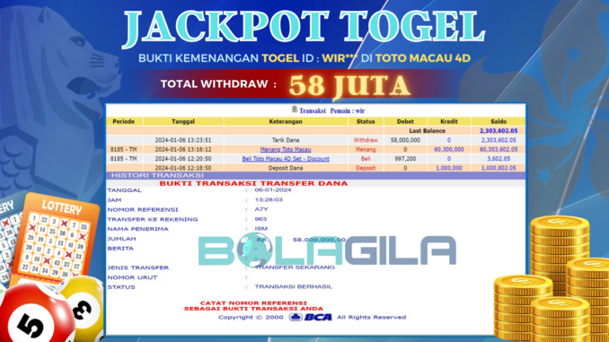MEMBER BOLAGILA MENERIMA PELUNASAN KEMENANGAN BOLAGILA JACKPOT TOGEL di TOTO MACAU 4D Rp 58.000.000,- LUNAS