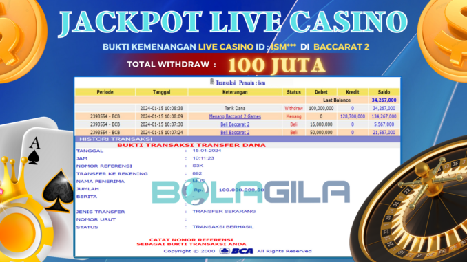 BOLAGILA JACKPOT LIVE CASINO DI BACCARAT 2 Rp 100.000.000,- LUNAS