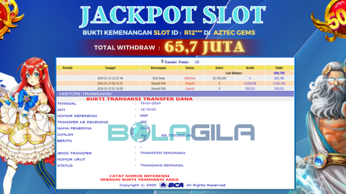MEMBER BOLAGILA MENERIMA PELUNASAN KEMENANGAN BOLAGILA JACKPOT SLOT DI AZTEC GEMS Rp 65.700.000,- LUNAS