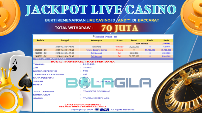 BOLAGILA JACKPOT LIVE CASINO DI BACCARAT Rp 70.000.000,- LUNAS