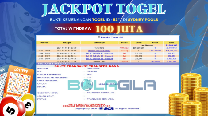 BOLAGILA JACKPOT TOGEL di SYDNEY POOLS Rp 100.000.000,- LUNAS
