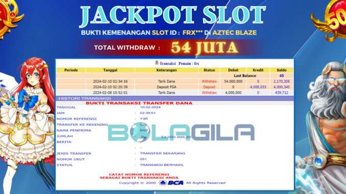 BOLAGILA mengucapkan selamat kepada user id : FRX*** yang telah berhasil mendapatkan jackpot SLOT DI AZTEC BLAZE. Kemenangan sebesar Rp 54.000.000,-. telah dibayarkan LUNAS oleh pihak bolagila kepada pemilik user id setelah yang bersangkutan mengisi formulir withdraw. Proses pencairan dana berlangsung sangat cepat hanya dalam waktu 6-11 menit sudah berada dalam rekening pemilik user id.