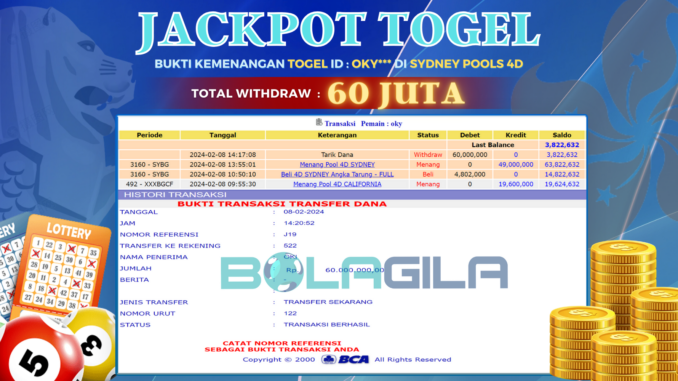 BOLAGILA JACKPOT TOGEL DI SYDNEY POOLS Rp 60.000.000,- LUNAS