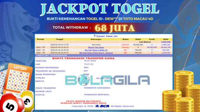 BOLAGILA JACKPOT TOGEL DI TOTOMACAU 4D Rp 68.000.000,- LUNAS
