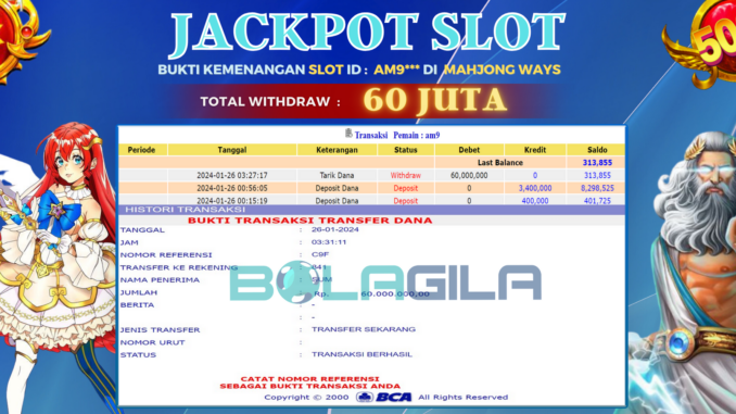 BOLAGILA mengucapkan selamat kepada user id : AM9*** yang telah berhasil mendapatkan jackpot SLOT MAHJONG WAYS. Kemenangan sebesar Rp 60.000.000,-. telah dibayarkan LUNAS oleh pihak bolagila kepada pemilik user id setelah yang bersangkutan mengisi formulir withdraw. Proses pencairan dana berlangsung sangat cepat hanya dalam waktu 6-11 menit sudah berada dalam rekening pemilik user id.