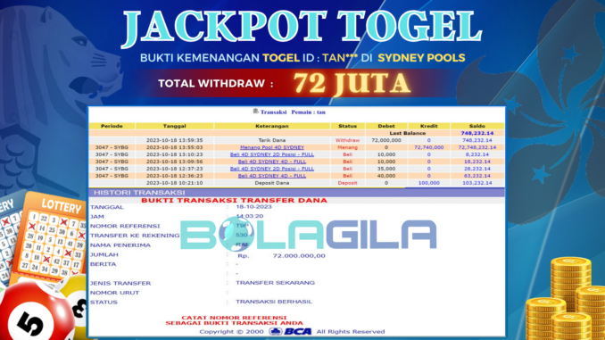 MEMBER BOLAGILA MENERIMA PELUNASAN KEMENANGAN BOLAGILA JACKPOT TOGEL di SYDNEY POOLS Rp 72.000.000,- LUNAS