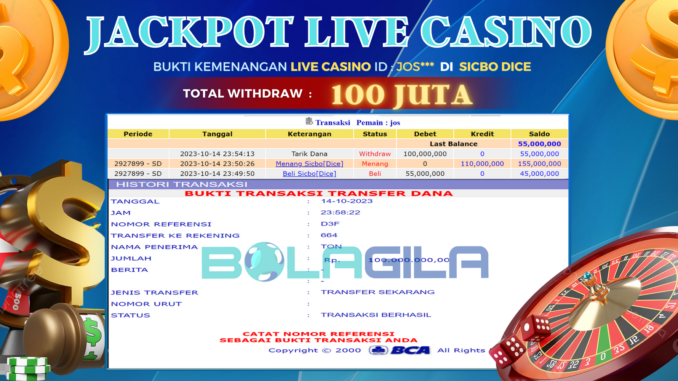 BOLAGILA mengucapkan selamat kepada user id : JOS*** yang telah berhasil mendapatkan jackpot pada permainan LIVE CASINO DI SICBO DICE . Kemenangan sebesar Rp 100.000.000,-. telah dibayarkan LUNAS oleh pihak bolagila kepada pemilik user id setelah yang bersangkutan mengisi formulir withdraw. Proses pencairan dana berlangsung sangat cepat hanya dalam waktu 6-11 menit sudah berada dalam rekening pemilik user id.
