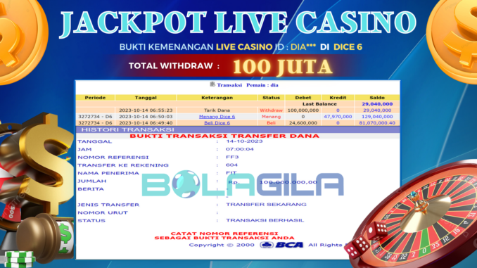 MEMBER BOLAGILA MENERIMA PELUNASAN KEMENANGAN JACKPOT LIVE CASINO DI DICE 6 Rp 100.000.000,- LUNAS
