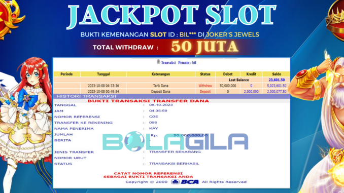 BOLAGILA mengucapkan selamat kepada user id : BIL*** yang telah berhasil mendapatkan jackpot pada permainan SLOT DI JOKER JEWELS. Kemenangan sebesar Rp. 50.000.000,-. telah dibayarkan LUNAS oleh pihak bolagila kepada pemilik user id setelah yang bersangkutan mengisi formulir withdraw. Proses pencairan dana berlangsung sangat cepat hanya dalam waktu 6-11 menit sudah berada dalam rekening pemilik user id.